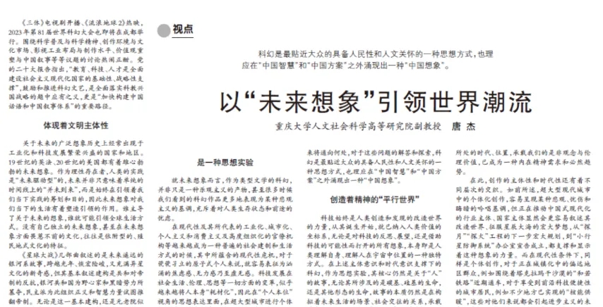 《三体》电视剧开播、《流浪地球2》热映,2023年第81届世界科幻大会也即将在成都举行。围绕科学普及与科学精神、创作环境与文化市场、影视工业布局与制作水平、价值观重塑与中国叙事等等议题的讨论热闹正酣。党的二十大报告指出,“教育、科技、人才是全面建设社会主义现代化国家的基础性、战略性支撑”,鼓励和推进科幻文艺,是全面落实科教兴国战略的题中应有之义,更是“加快构建中国话语和中国叙事体系”的重要路径。