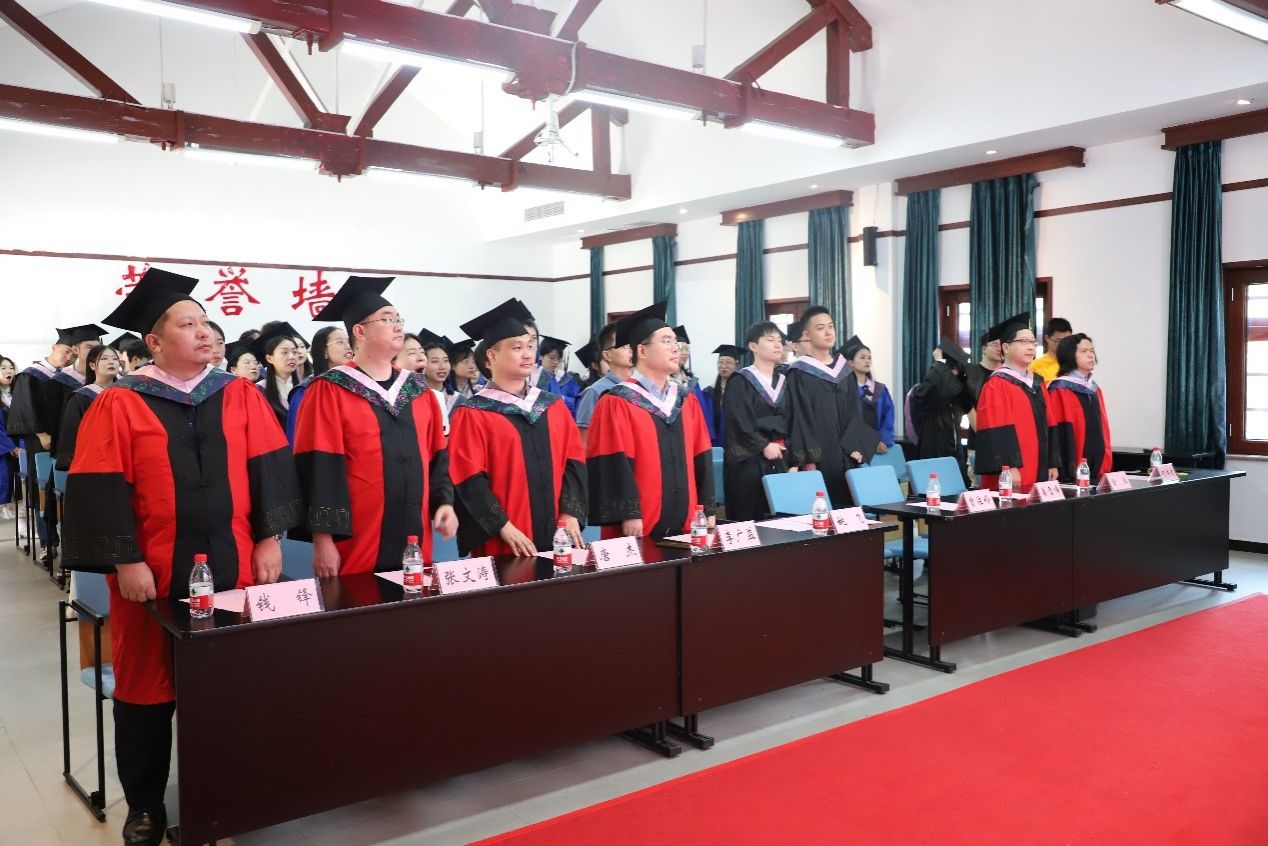 在庄严的国歌声中典礼拉开序幕。姚飞院长首先致辞,祝愿每一位毕业生在人生的道路上获得辉煌的成就,希望同学们在实现个人理想的同时,始终保持初心和使命,为建设美好社会、创造美好未来而努力。其后硕士毕业生代表王梦雨和本科毕业生代表黄经宸先后上台发言,他们饱含深情回忆大学生活,表示将牢记“耐劳苦、尚简朴、勤学业、爱国家”的重大精神,在人生道路上砥砺前行。随后教师代表何祥迪进行寄语,希望大家能够“尊德性而道问学”,永远保持向上。师生代表发言过后,由学院党委副书记姜雪峰宣读学院2023届优秀学位论文和优秀学生名单并进行颁奖。随后毕业授位仪式正式开始,毕业生们依次上台,由老师们为其拨穗并送上真挚勉励与祝福。典礼最后,全体同学齐唱校歌,歌声嘹亮,充满对母校的款款深情。