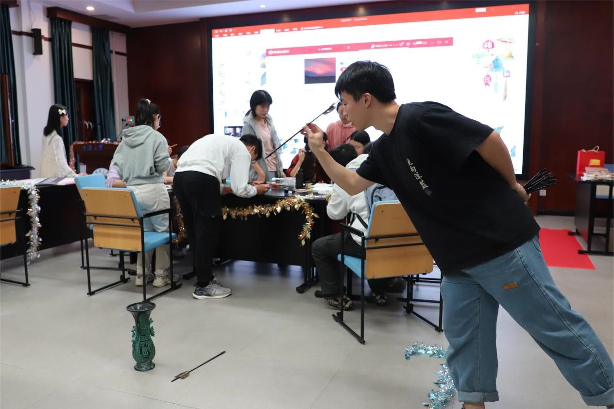“诗酒琴棋客,风花雪月天。"接下来的趣味环节为活动增色不少。主持人生动地介绍了活动规则,大家便投入到传统投壶、趣味简牍猜和黑白弈等项目中。在传统投壶比赛中,参与者争分夺秒地投掷陶制壶,不仅提升了他们的手眼协调能力,还让他们深刻感受到这项中国古老活动的趣味所在。趣味简牍猜游戏则考验了参与者对汉字的识别能力,激发了他们对古代汉字和中国书法的兴趣。而黑白弈则使参与者沉浸在思维和策略的世界中,体会到中国古老棋艺的悠久魅力。在这一过程中,参与者们对传统文化活动的了解更加深入。通过亲身体验这些游戏,参与者不仅是观众,还成为了传统文化的实践者和传承者。他们更加了解和珍视传统文化,体验到了中华文化的博大精深。