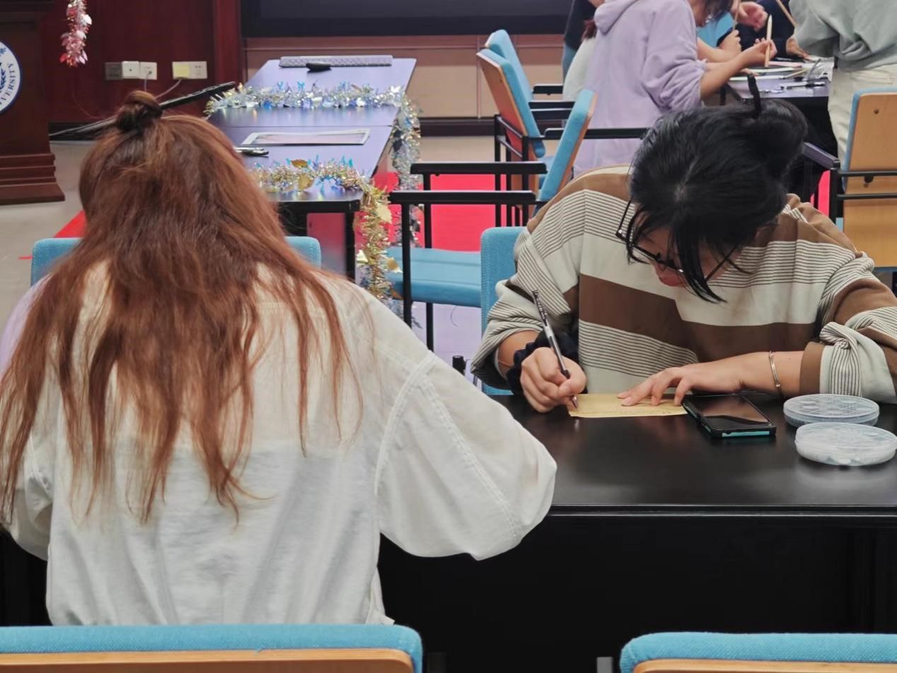 “能令书信数,犹足缓相思。”晚上8时,活动进入了“书信传情”环节。主持人详细介绍了环节规则,随即向每位参与者分发了精美的信纸、信封和邮票。在这一神奇的时刻,每个参与者都沉浸在思考之中,他们聚精会神地书写文字,表达情感、寄托思念。这个环节不仅是一次真挚情感的传递和表达,同时也是对中国书信文化的珍贵传承,将这一传统方式的书信传递带入了现代生活。在结束时,参与者将他们的文字一同投入回收信封,留下了美好的回忆。这不仅是寄托自身情感的信件,更是传统文化的凝结与再生,体现了中国文化的博大和延续。