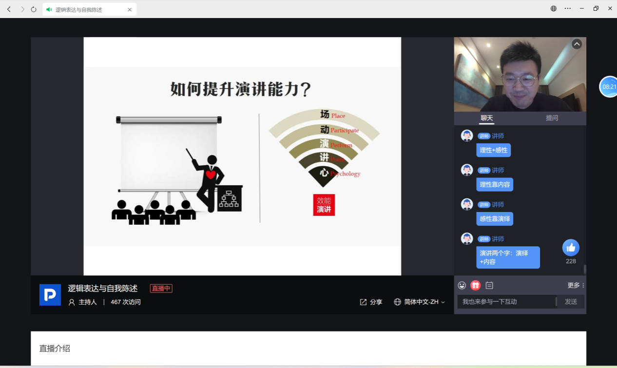 承办的《逻辑表达与自我陈述》主题讲座于线上成功举办。本次讲座邀请到互联网人力专家、腾讯金牌讲师、《教练型领导力》授证咨询顾问袁野老师主讲,近200余位同学参加,现场氛围热烈。