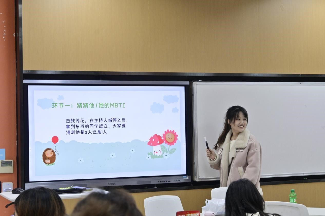 主题班会第一个互动环节——“猜猜他的MBTI”。通过击鼓传花,拿到东西的同学起立,大家猜测他是E(外向)型人还是I(内向)型人,随后将提前调查的MBTI数据公布,加深同学们之间的相互了解。当下MBTI成为了一个热门话题,设置这个环节也是意在告诉大家:在讨论MBTI时要特别注意不要陷入绝对的自我标签和他人的刻板印象,大家要正确看待自己的MBTI,E型和I型都是个人的性格特征,并无好坏之分,一个集体里总是外向和内向共存的,每个人都可以发挥个人的价值,同学们应欣然接受自己的性格,找到适合个人性格发展的路径。主持人也强调“MBTI应该只是大家认识自我的一个起点,而绝不是终点。希望我们每个人都能从这里出发,去认识更多面、更丰富的自己。”