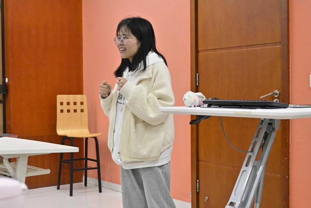 第二个互动环节是“你来比划我来猜”,全班同学分成了六个小组,每个小组派一名代表上台,只能通过肢体动作来表达所看到的词汇,其他小组成员需要在没有语言提示的情况下猜测该词,这是对大家的肢体语言表达能力与联想能力的全面锻炼,也是生活在共同时代的我们探索共同的时代记忆的良好平台。同学们幽默有趣的表达方式引得全场笑声频频,大家都沉浸在欢乐的氛围中,将烦恼也都抛在脑后。