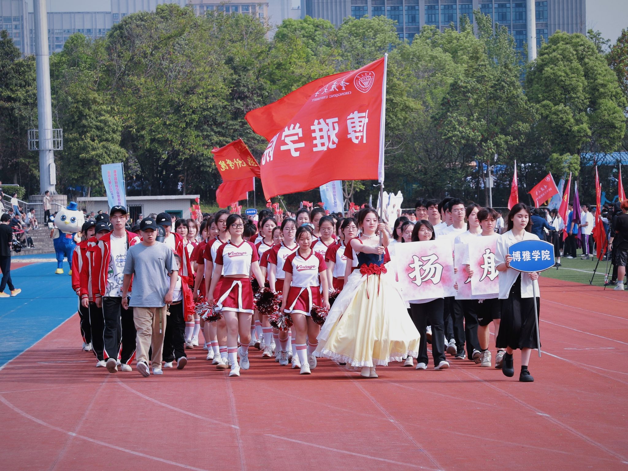 在开幕式上,55位博雅学子组成的方队进行了街舞、啦啦操、队列的精彩展示。街舞部分以一曲《蒙娜丽莎》为背景的音乐点燃全场,队员们精湛的舞技与熟练的走位赢得了全场师生的掌声与欢呼声。伴随着《OH!》音乐的响起,啦啦操队员们跳跃着入场,她们热情挥舞着手中的花球、笑容灿烂、动作整齐,展现出青春活力的大学生形象。表演部分结束, “青春疾驰,运动启航,博雅学子,斗志昂扬”的口号在运动场上响起,博雅学子拼搏与奋斗的形象也留在了赛场上。