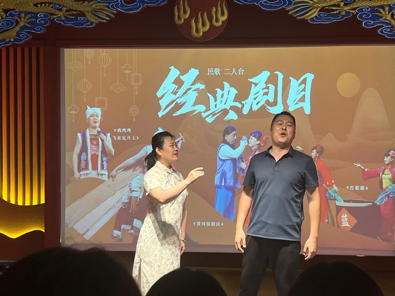 三位专业的二人台戏曲表演艺术家在黄河流域保护展览河曲馆现场演绎了经典曲目《想亲亲》和《拜大年》,歌喉嘹亮,余音绕梁,在场师生无不深深陶醉。二人台唱出了河曲人民的悲欢喜乐,呈现了河曲县深厚的文化底蕴和迷人的地域特色。师生们在歌声中见证了黄图高原千沟万壑间,黄河九十九道弯孕育出的小小村落里,河曲人民战天斗地、改造水土、歌唱美好生活的勃勃生机。