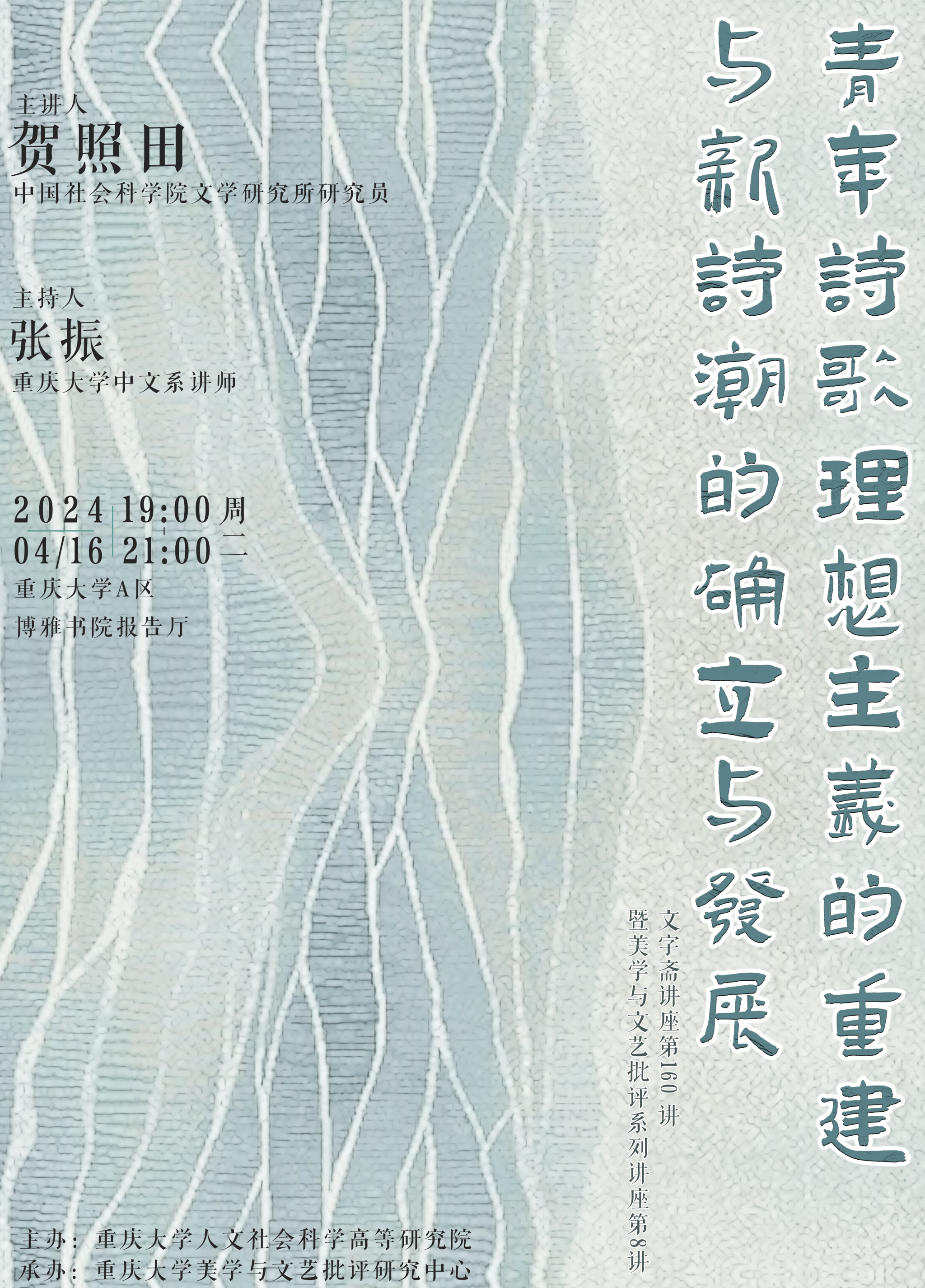对于理解“新时期”转折时段以及随后1980年代的文学、思想与历史而言,青年理想主义的转承,是一个不可或缺的重要视角。而其时以朦胧诗为代表的新诗潮,则为我们重新清理与把握“新时期”及1980年代青年理想主义的观念构造和意识状态,提供了一个具有关键意义的透视点位。在本次讲座中,贺照田研究员将以《今天》发刊词和1970年代末1980年代初北岛、江河、顾城、杨炼的有关写作与认识为分析中心,探讨新诗潮中的“时间”“自我”“人民”“理想”等观念的内在构造及其所体现的意识逻辑,细致地展开这一以往未得到充分正视与讨论的文学-思想-历史褶皱,从而为今天重新思考诗歌与文学、思想与历史,提供有益的参照与启发。