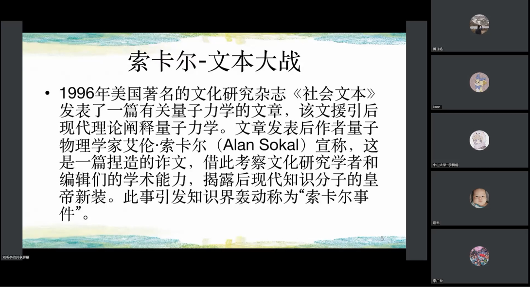 第一部分中,刘昕亭老师重点介绍了“索卡尔-文本大战”引发的“后”学危机。1996年,美国物理学家艾伦·索卡尔(Alan Sokal)故意制造了一篇以后现代理论阐释量子力学的文章,竟然在《社会文本》成功刊发。这次来自科学家的挑战表明,“语言学转向”开启的非确定、非同一范式已经精疲力竭,一种带有科学主义倾向的实证研究再度笼罩人文学科。面对“索卡尔事件”对相对主义文化研究方法的冲击,西方理论家选择不同的后(Post-)路进行应对,其中最具代表性的理论是“后人类”与“超人类”。