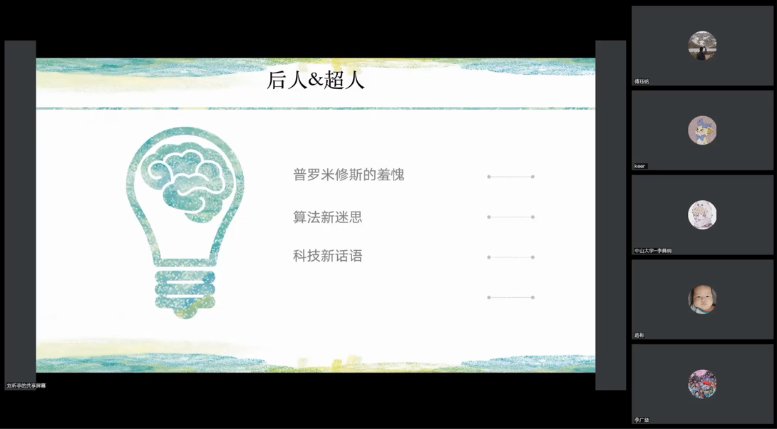 讲座最后,刘昕亭老师与李广益老师就反人类中心主义的集中叙事进行了补充讨论。刘昕亭老师对反人类中心主义的四阶段进行了总结,认为在后人类时代依然可以保持对人类的一些基本信任,这恰恰是数字时代中国叙事中一个非常值得肯定的地方。在互动提问环节,会议直播间的师生纷纷提问,刘昕亭老师就非人与超人的概念辨析等问题进行了一一的解答与回应。主持人李广益老师简短总结后,讲座在热烈的氛围中圆满结束。