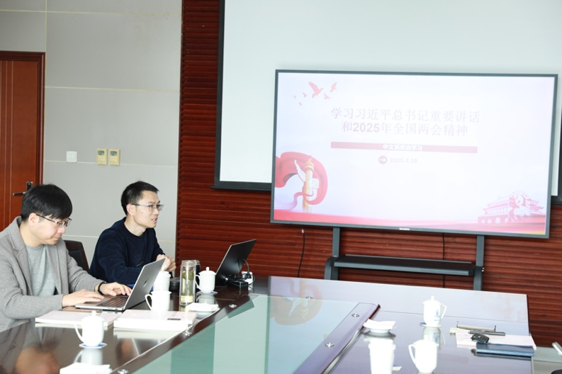 在政治学习环节中,中文系党支部副书记刘光洁老师带领全系教师共同学习了习近平总书记关于教育的重要讲话和2025年全国两会精神,之后汇报了中文系党支部年度计划与安排。