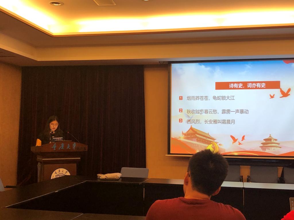 安楠同学以“党史是最好的营养剂”为主题进行了分享。她强调我们要为实现中国梦补钙铸魂,结合了“烟雨莽苍苍,龟蛇锁大江”等传统文化中的毛泽东诗词以突出学好党史新中国史的重要性。安楠同学提示我们应坚持运用辩证唯物主义的世界观与方法论,不断深化对初心和使命的理解,与学习习近平新时代中国特色社会主义思想相结合。
