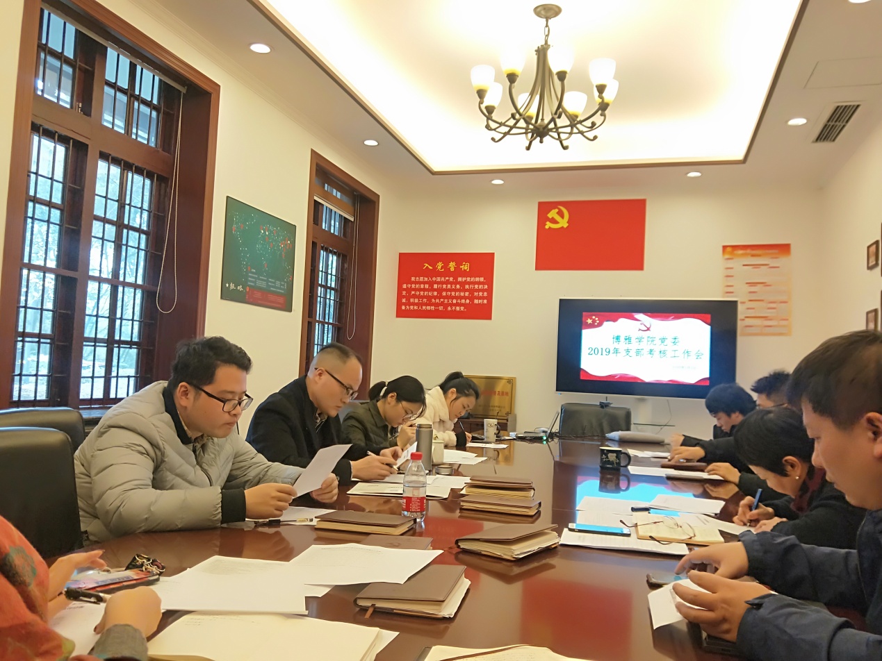 党委于2020年1月2日上午10点在文字斋小会议室召开了党支部党建工作现场考核会。学院党委书记曾佐伶、副书记胡佳、党委委员以及各支部书记参加了此次考核会。