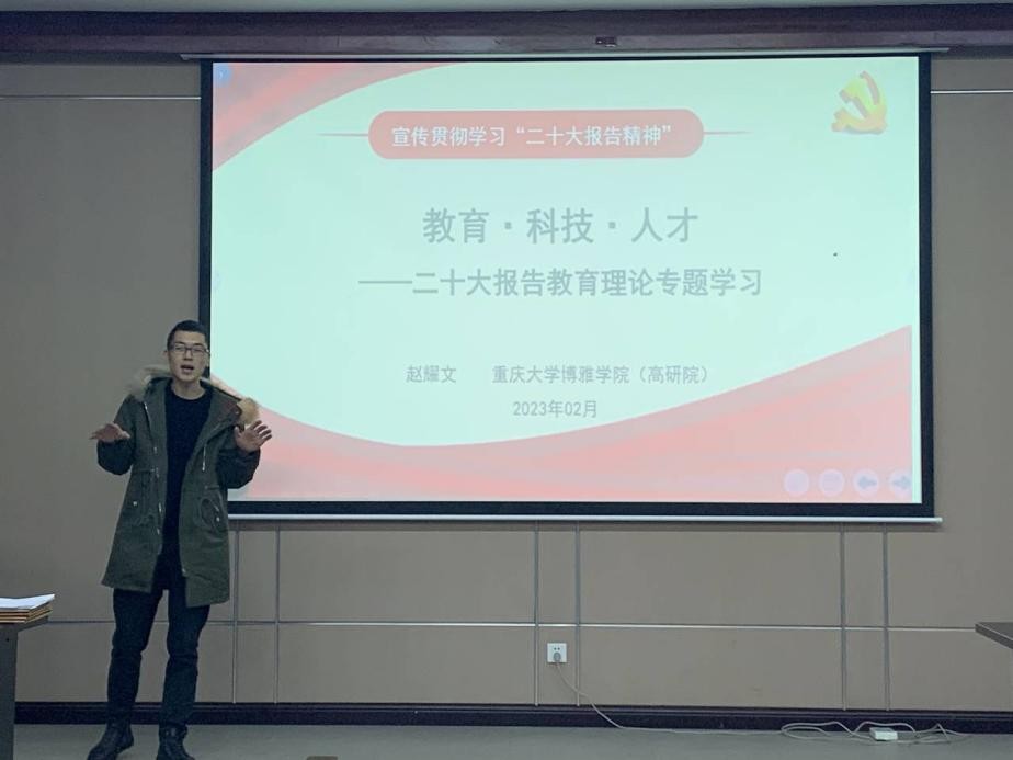 本科生支部、教工四支部于2月21日下午在博雅小院报告厅进行了二十大报告专题学习。学习由本科生支部副书记赵耀文主讲。