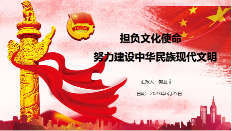 报告厅以“担负文化使命 努力建设中华民族现代文明”为题,对习近平总书记在中国历史研究院文化传承发展座谈会上的重要讲话进行了学习。樊亚菲同志从概念的提出、中华文明的特性及其与中国特色社会主义道路的关系等三个方向进行了汇报,强调新时代青年要以习近平总书记重要讲话精神为指导,不断深化对文化建设的规律性认识,更好担负起新的文化使命。