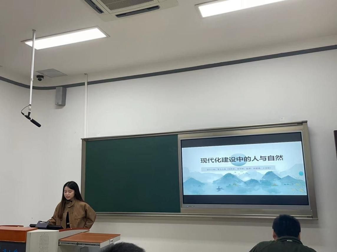 最后,小组成员通过重庆涪陵816核工程,讲述了在现代化进程中如何更好地平衡和协调核能源的开发利用与自然环境的保护之间的关系,并对现代化进程中的人与自然的关系进行了总结,要以人与自然和谐共生的理念为行动指南,建设人与自然和谐共生的现代化。