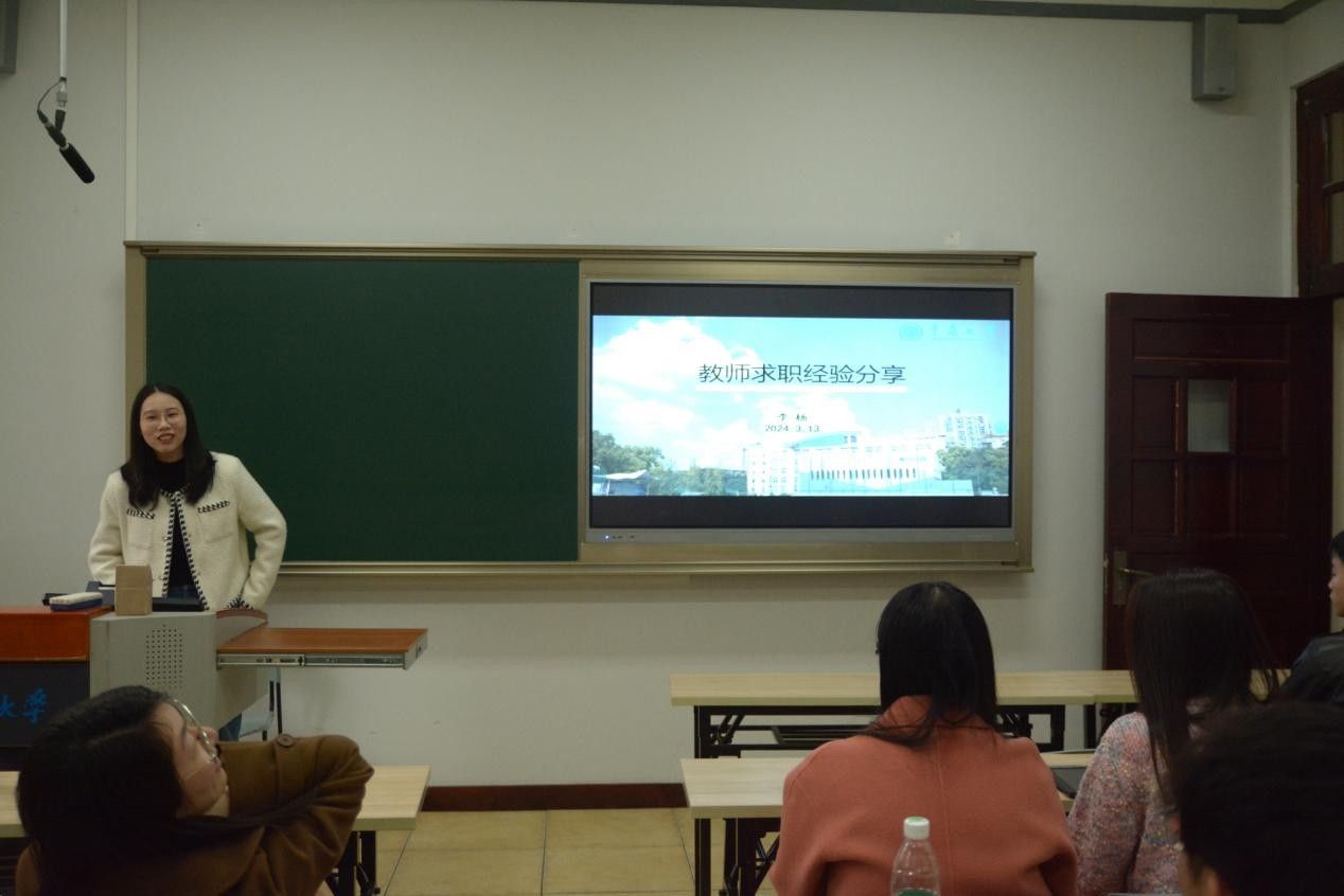 理论学习结束后,支部展开了求职就业经验分享会。黄丹玲、闫洪菁分别就笔试、面试两个方面与大家分享了备考选调生的经验。随后,支部前副书记、现从事中学历史教师工作的李杨同志,从招聘信息收集、工作技能储备和面试准备三点展开论述,为有志于投身教育事业的同学提供了重要的帮助。三位同志的分享不仅内容充实,实用性强,还极具针对性,他们的经验和建议为在场的同学们提供了很多有益的帮助。