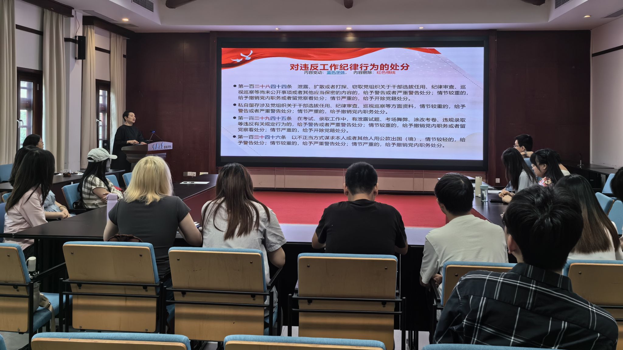 学院党委书记曾佐伶向全体毕业生党员讲授了“贯彻纪律处分条例——恪守工作纪律、规范履职用权”的专题党课。她以习近平总书记在二十届中央纪委三次全会上发表的重要讲话,引入《中国共产党纪律处分条例》相关内容的学习,从《条例》的修订背景与意义、工作纪律解读、案例分析及笃信践行四个方面带领大家学习了六大纪律中工作纪律的重要性和实践意义。曾书记通过违纪案例,生动的说明了工作纪律是党的各级组织和全体党员在党的各项具体工作中必须遵守的行为规则,是推动党的工作和事业健康发展的重要保证。她希望毕业生党员同志,在未来的工作、学习中,要坚持严以律己,遵守组织纪律,筑牢底线意识,把六大纪律贯穿自己工作和生活的始终。
