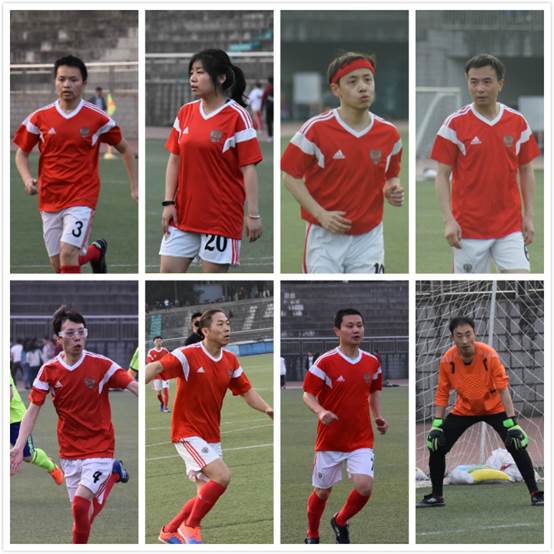 比赛前半个小时,身着红色球衣的老师们早已开始准备热身、商量战略,期待一展身手。随着裁判的一声哨声,球场上顿时沸腾起来。我方队员不断组织进攻,攻势逼人,一度打乱对方阵脚。然而,对方抓住时机,只见角球传中,进了一个头球。但我方队员心态保持较好,频频将球带入对方后半场。可惜的是,我方四次有威胁性的进攻不是撞球柱,就是被扑出。场边观看比赛的师生连连跺脚、直叹可惜。这时,上半场比赛也以落后一球结束。