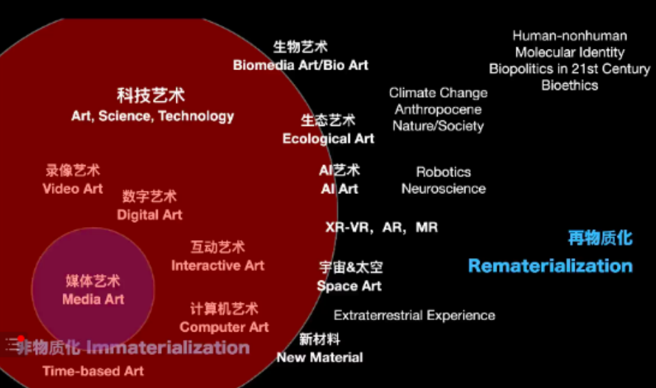 首先,魏颖老师从“科技艺术”这一概念切入,通过对艺术史的梳理来明确当代艺术的位置及其转向。当代艺术的发展与进步主要源于1960年代后所产生的碎片式、爆炸式的艺术呈现,如人们所熟知的观念艺术、行为艺术等都是在这一转向之后出现的。科技艺术的形式多种多样,不仅有录像艺术、互动艺术、数字艺术,而且发展到今天还出现了生物艺术、生态艺术、XR-VR、AR、MR(扩展现实-虚拟现实、增强现实、混合现实),科技艺术的前身媒体艺术就是以录像艺术作为起点而出现的。
